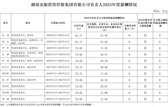 湖南出版投資控股集團有限公司負責人2023年度薪酬公示